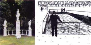 Due i progetti per Torino. 1) Omaggio alla prostituta con una composizione di sculture bianchissime in stile classico nel parco della Pellerina, dove battono le puttane di colore (100.000 con...). Sculture, che si riallacciano alla tradizione dei giardini all'antica, all'idealità bucolica, fanno da controcanto a quanto avviene intorno: traffico veloce, prostituzione, inquinamento ottico, acustico e atmosferico. Così, l'arte, nel suo contrasto con la realtà, pone domande alla vita e ai suoi drammi, con un sogno di bellezza verso cui tendere. 2) Una finta strada romana da costruirsi nel prato prospicente Porta Palatina Strada cintata da una ringhiera di ferro che ne preclude l'accesso. Così, viene privata della funzione pratica, impedendone la percorribilità. Con un'operazione di détournement, ci dà opere che fanno i conti con la realtàà. |