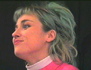 Questo è un lavoro dell'anno scorso. Questa è una fotografia del "baby studio" che abbiamo fatto, una specie di Hollywood in miniatura. Ho invitato dieci cantanti a partecipare. Prima di venire ho dato a ciascuno loro un CD di musica e loro l'hanno interpretato. Ciascuno dei cantanti avevano il suo proprio angolo dove interpretare il pezzo, e qui si vede l'allestimento dello studio. Le lampade sono state sponsorizzate da un produttore di film porno. Qui siamo nella produzione: questa è Pierangela Compagnino dalla Sicilia, una delle cantanti (Fig. 5). Ogni giorno veniva una cantante e ogni notte montavo il loro pezzo. Qui vediamo una fotografia di Southit, la donna il cui video vi mostrerò completamente. Mirielle ci sta facendo vedere sulla mappa da dove originariamente proviene. È stata costretta a fuggire da Istanbul, che è il motivo per cui canta il suo pezzo in turco. Aveva un studio molto semplice ed economico; qui si può vedere il tipo che mette il microfono nei capelli della cantante. Alla fine, a Ginevra, avevamo un'installazione di dieci monitor, ciascuno con una donna diversa. Era per la mostra di Paolo Colombo, e lui ha cucinato per noi tutti i giorni. Qui mi si vede osservare un video. Passo sempre molto tempo a guardarli. Se ho cinque minuti di nastro lo devo guardare almeno trenta volte prima di tagliarlo!