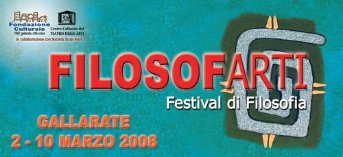 Gallarate (Va), 21 febbraio 2008 – Gallarate si prepara alla terza edizione di “FilosofArti”, il festival della filosofia e delle sue intersezioni con le arti, organizzato dal 2 al 10 marzo dal Centro Culturale di Prosa del Teatro delle Arti e dalla Fondazione Culturale “1860 Gallarate Città” onlus con il patrocinio dell’Agenzia Nazionale per lo Sviluppo dell’Autonomia Scolastica – Lombardia, dell’Ufficio Scolastico Provinciale di Varese, della Regione Lombardia, dell’ Assessorato alla Cultura del Comune di Gallarate, della Provincia di Varese, del Melo-Università della Terza età, della Civica Galleria d’Arte Moderna di Gallarate, del Sestante Fotoclub e di molte altre realtà cittadine e di varie case editrici.